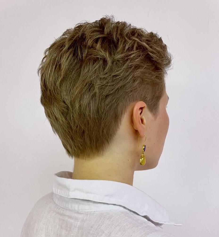 Pixie is a short hairstyle that is cut close to the head on the sides and back and slightly longer on top and features textured, feathered or choppy layers. The length of a pixie can vary from half an inch to three inches, which allows to create a flattering cut for different hair types and face shapes, making it a versatile option for many women.