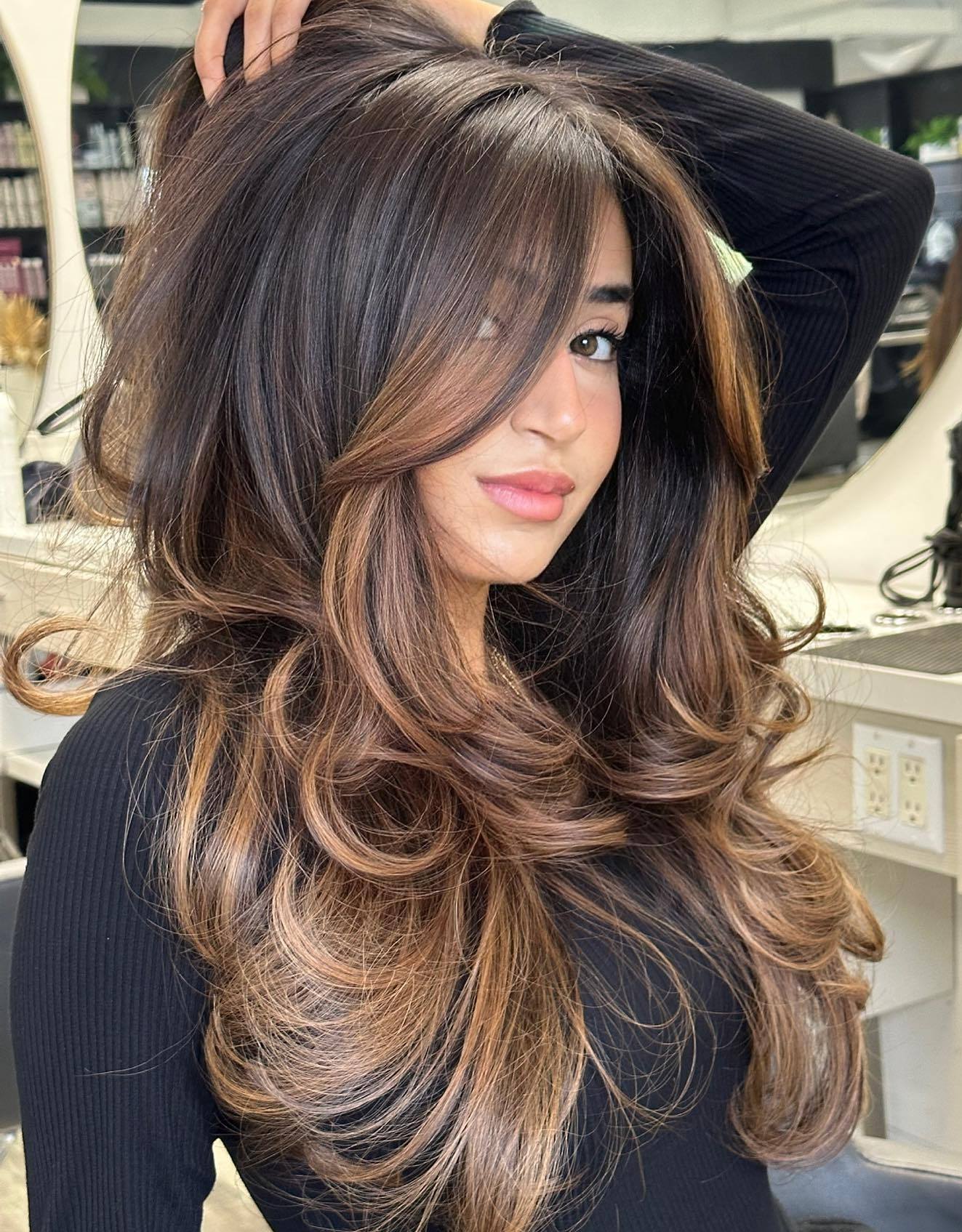 Your thick, lush hair looks gorgeous when it’s worn with layers. The lowlights run from the roots through layered strands, and down to the ends; a coloring technique that adds dimension to the voluminous shape of the long, feathered cut.