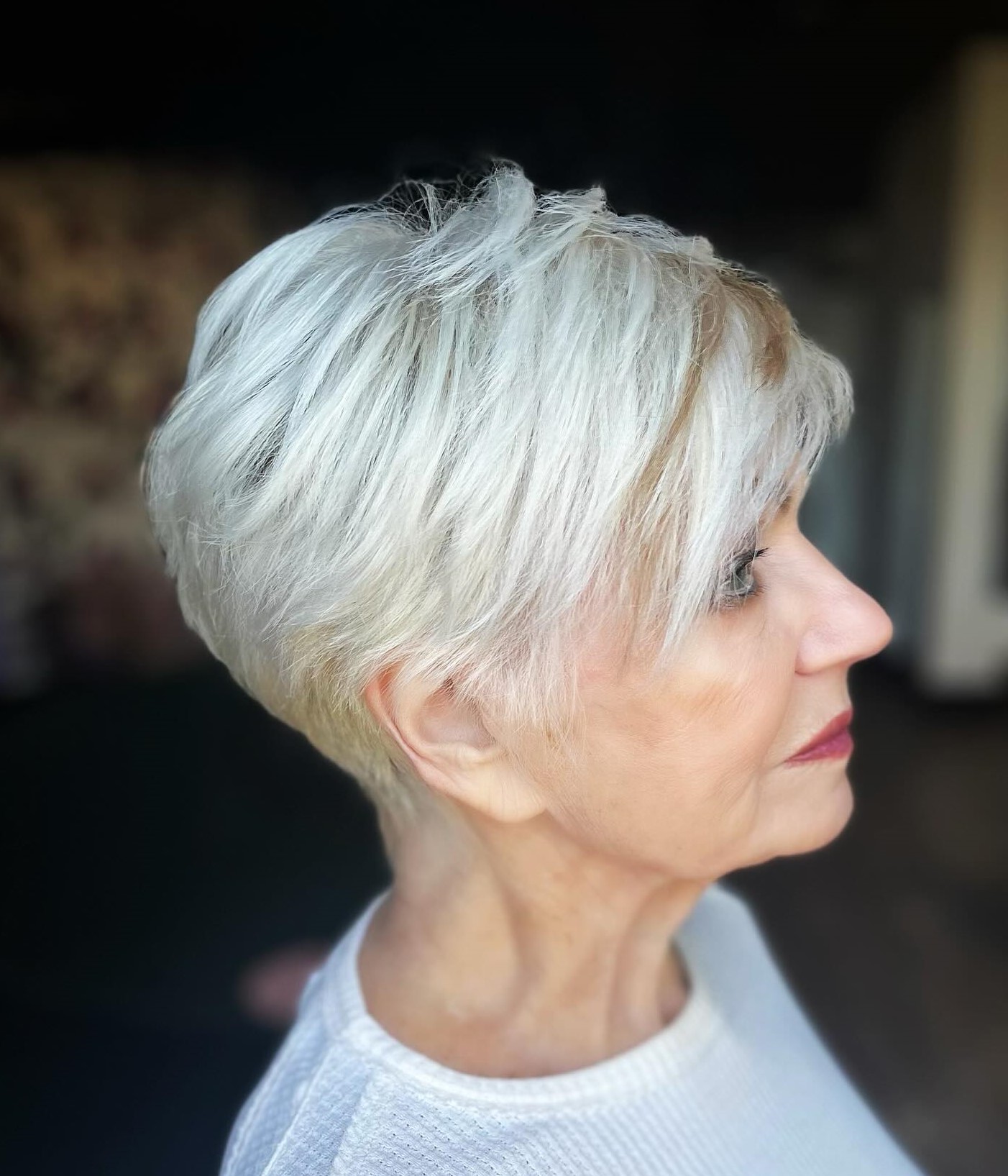 The tousled, staggered layers of the short pixie are a wonderful way for women with fine hair to look young and stylish because the feathered effect adds height and volume. The tapered nape area works as a back-frame for the pointy sideburns that accentuate the cheekbones.
