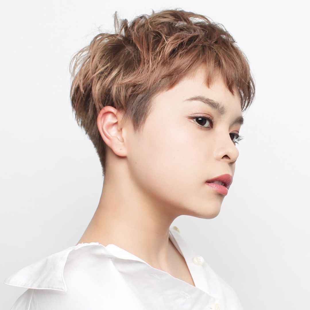 Soft in texture and color, this beautiful pixie haircut is meant for delicate, fine strands. Side part and blow out your locks with a round brush, and backcomb the crown for maximum volume.