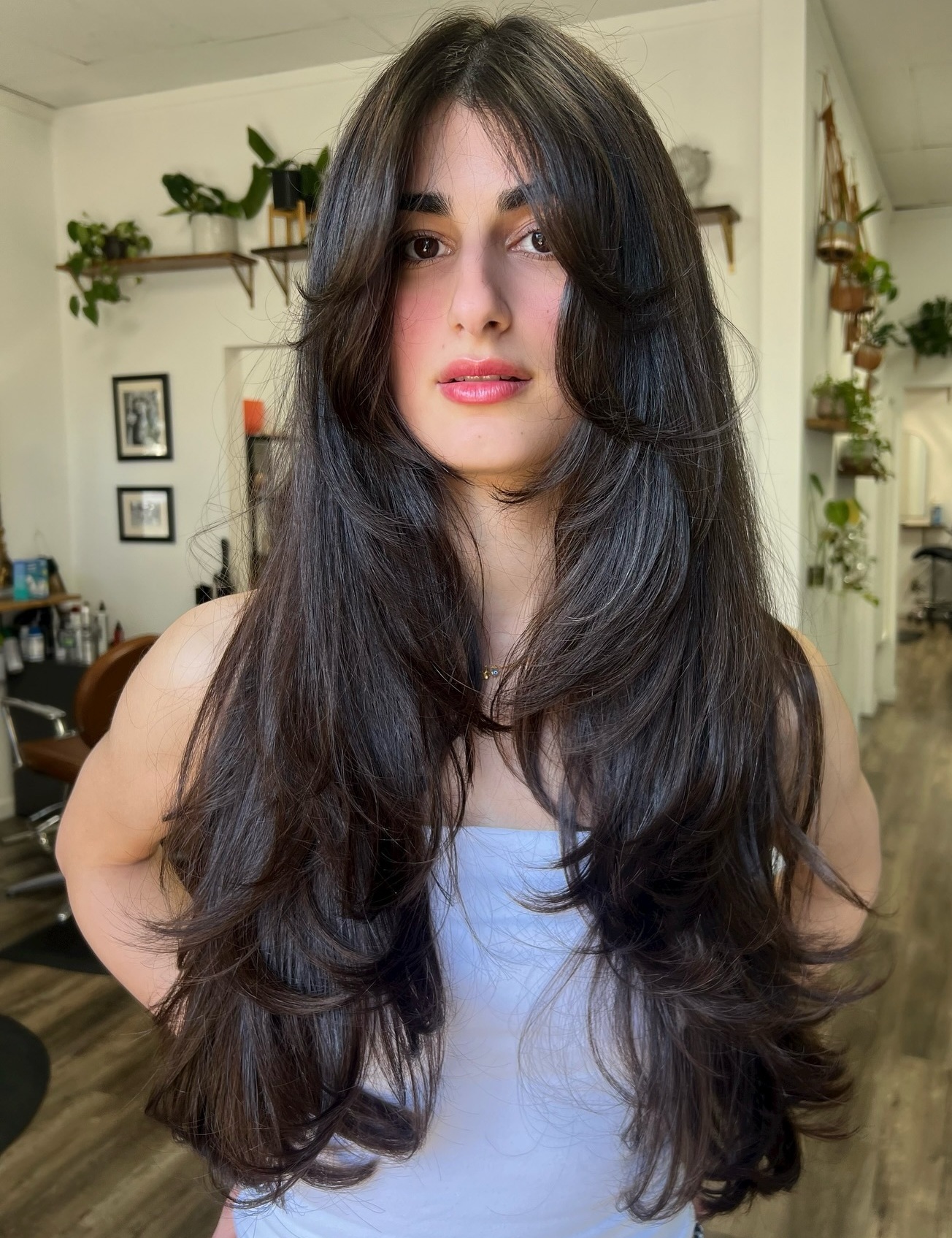 This cut gives you sleek, chic texture and shine with medium to long layers and perfectly feathered ends without sacrificing length. The idea is to create shape and give your hair movement.