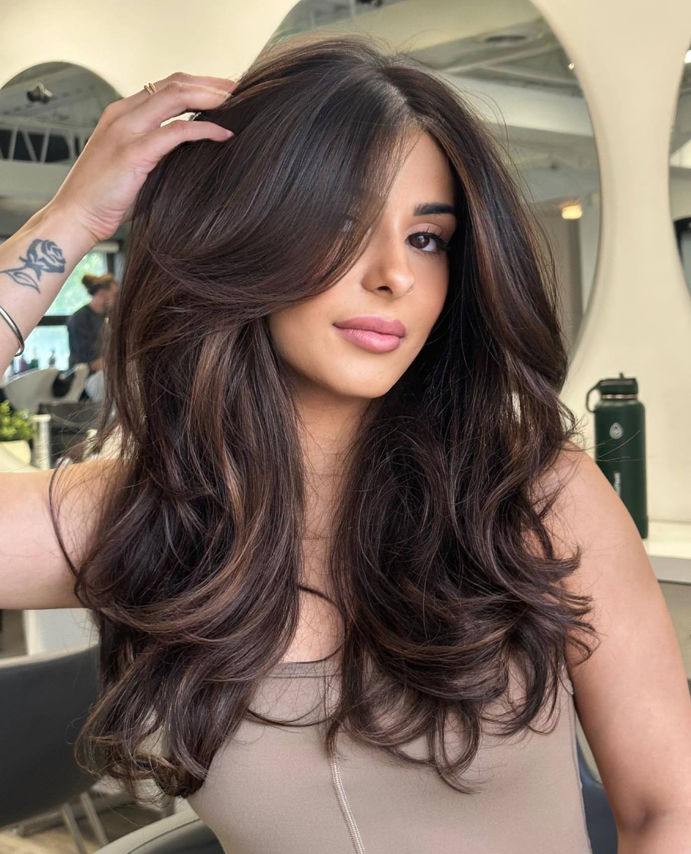 Your thick, lush hair looks gorgeous when it’s worn with layers. The lowlights run from the roots through layered strands, and down to the ends; a coloring technique that adds dimension to the voluminous shape of the long, feathered cut.