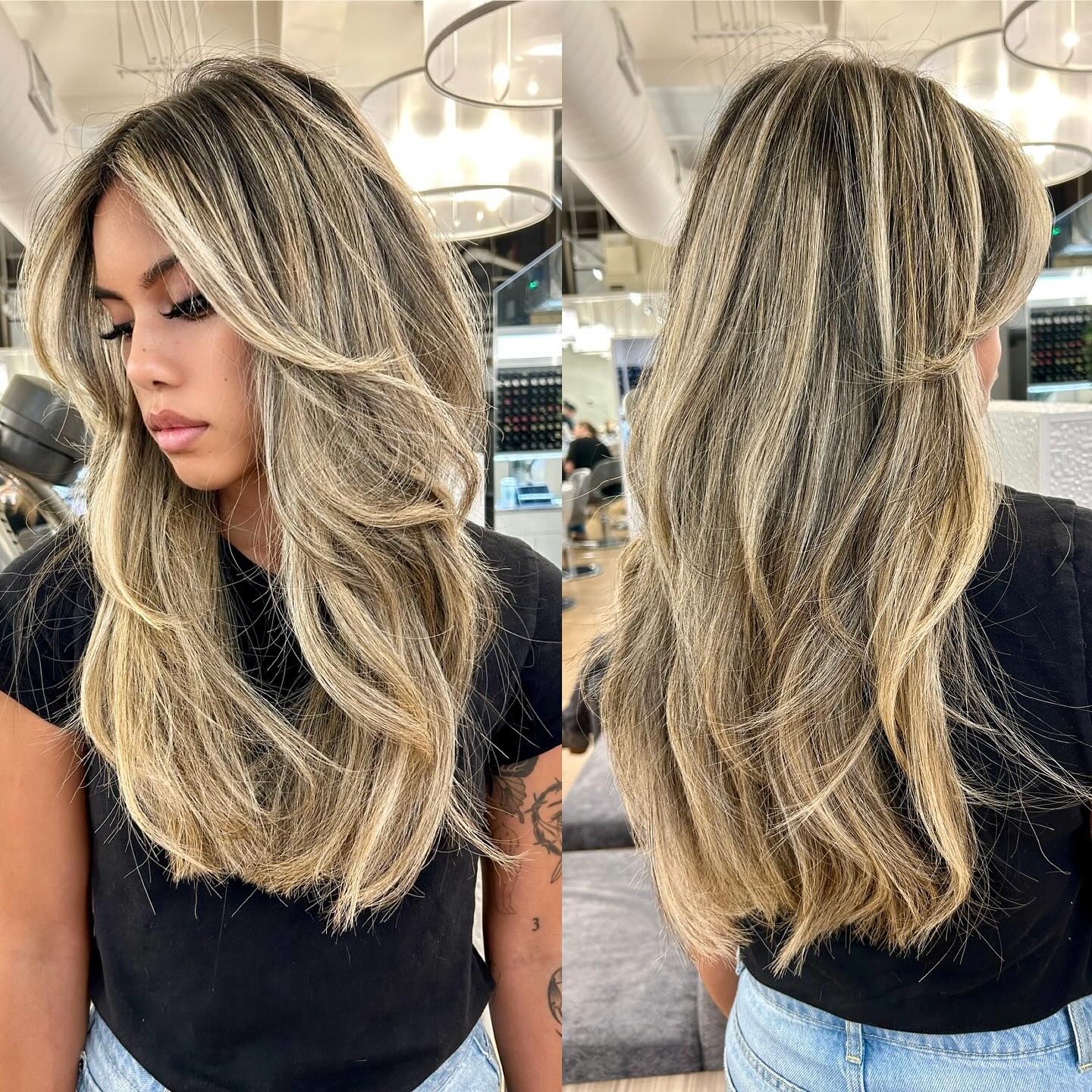 Long haircuts can fall flat without the right layering and style. Try flipping the ends of the individual tiers by using a straightening iron or round brush. When you strategically cut short layers on lengthy hair you create shape and depth. The golden blonde balayage and bronde base tone also help to give a sense of structure and volume.