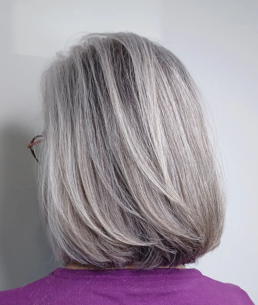 Embracing your grays? Start by blending your natural color with highlights or lowlights to ease the transition. Gradually trim dyed ends and use purple shampoo to keep brassiness at bay.