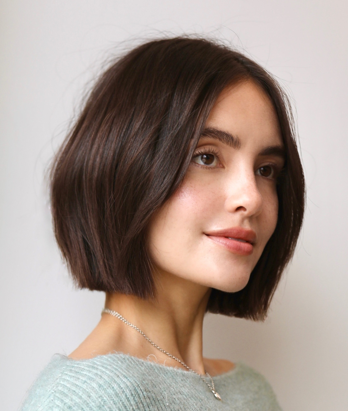 A one-length cropped bob is stylish and professional, yet retains an ultra-feminine flair and pizzazz. This sleek brunette haircut features an off-center part and works best with fine hair that can hold a slight curl.