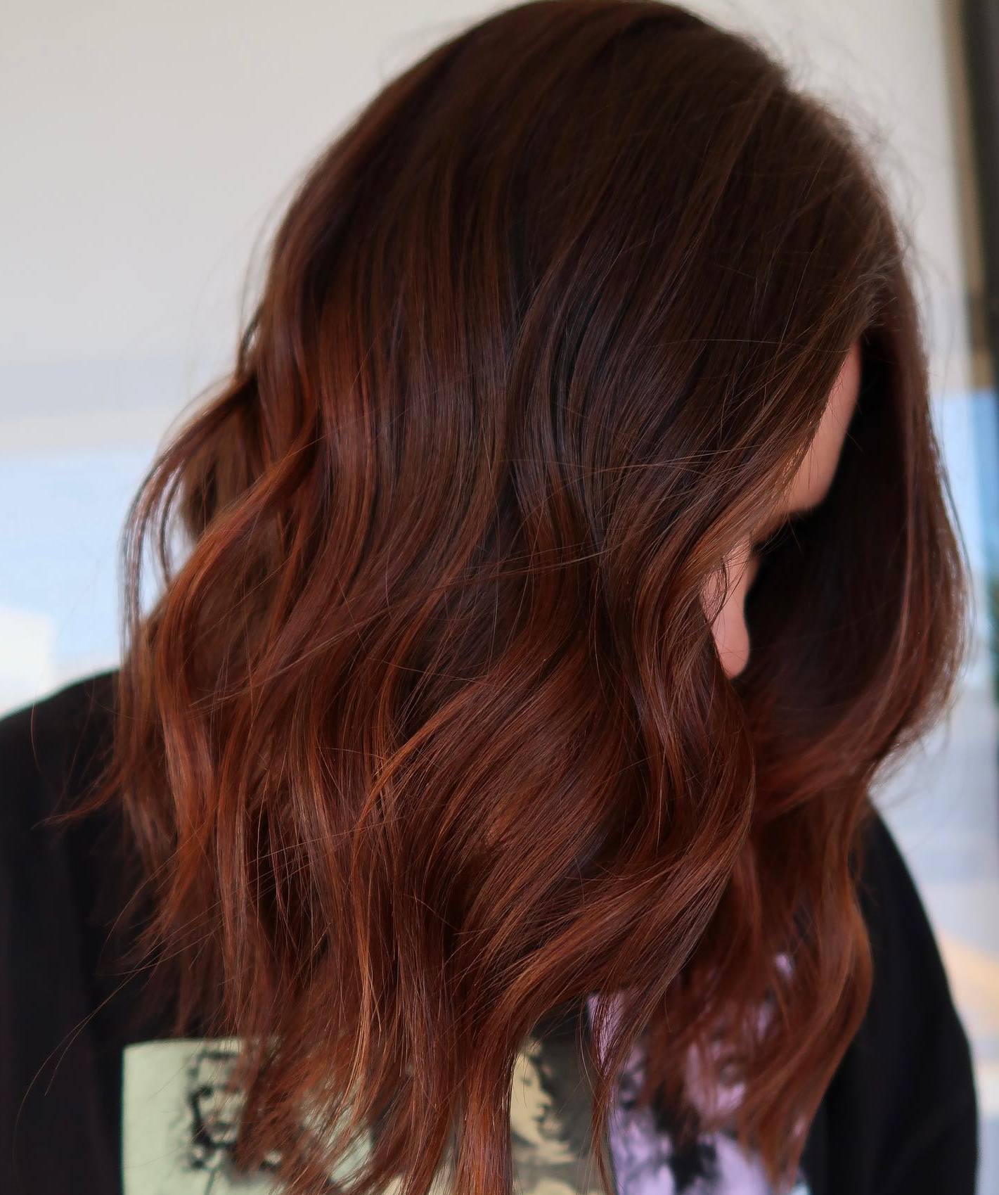 If you have naturally wavy hair, this well-blended balayage is a perfect choice to accentuate your texture. Go with a medium brown for the roots and a beautiful auburn, as the main color, gaining its intensity towards the ends.