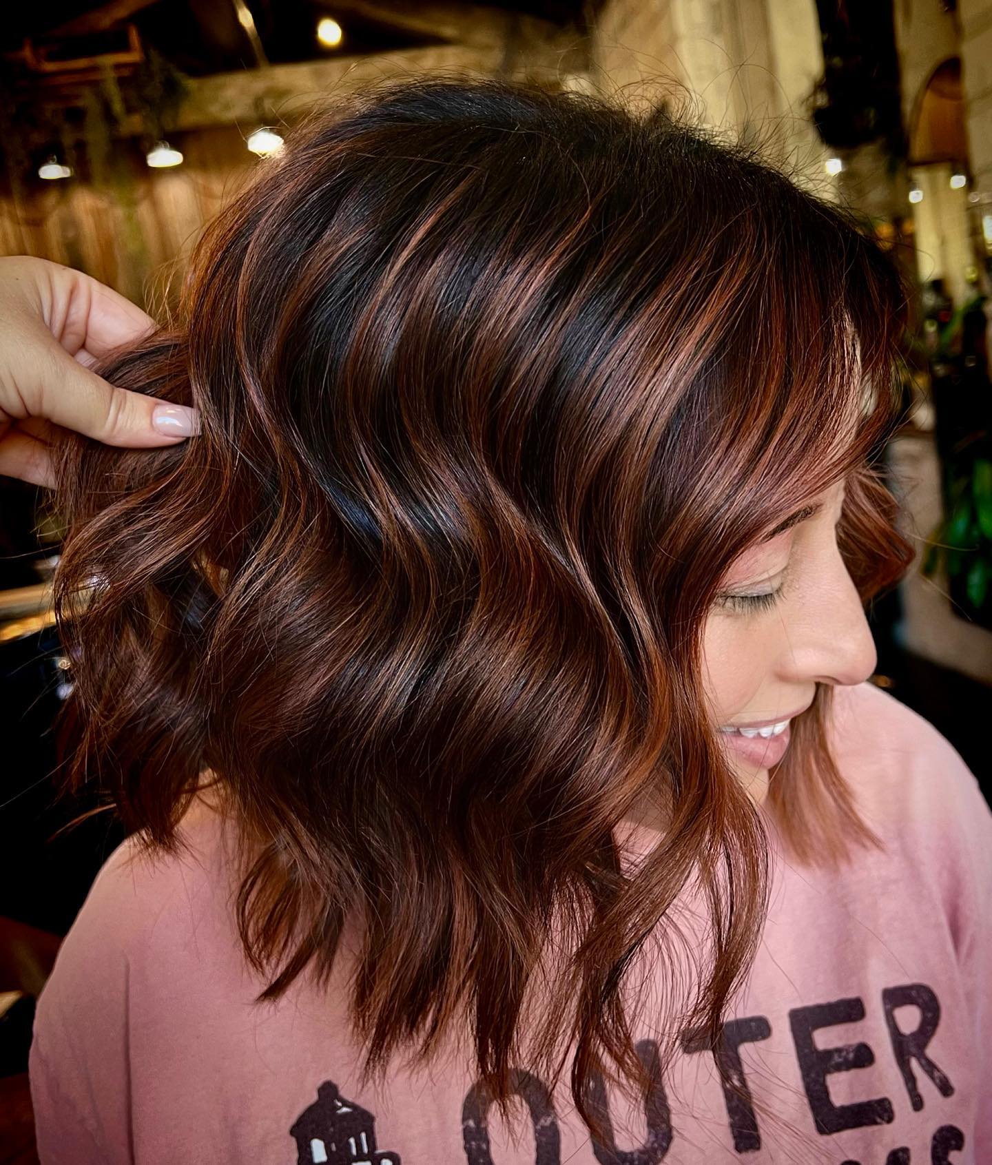 A wavy long bob is a stylish cut in itself, but imagine how awesome it will look if highlighted with copper brown shades. Such highlights lend great shine and vibrance to your locks, which is great for those dealing with naturally lackluster locks.