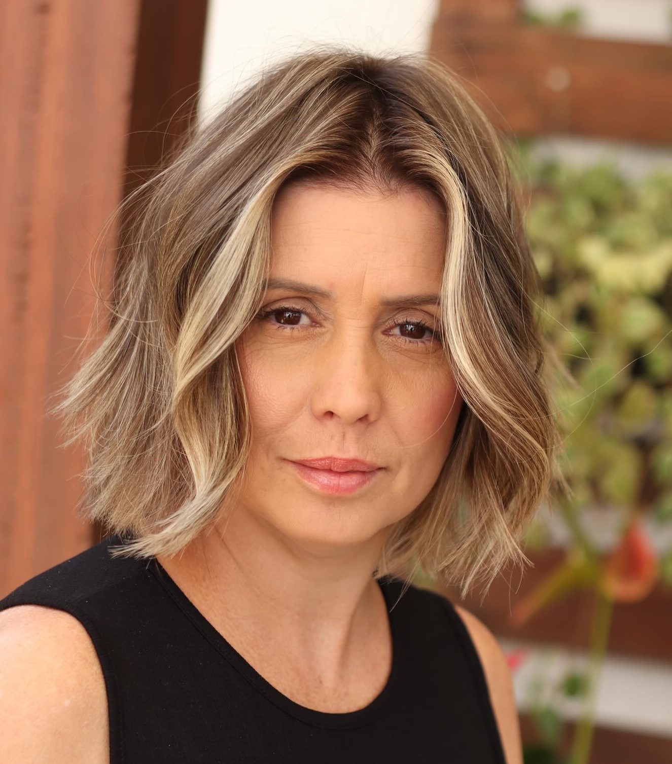 Another efficient way to look younger in your 40s is to get a wavy bob and a trendy blonde balayage. The soft transition from fair hair to bright blonde makes the color truly exquisite. Besides, the length is perfect for those who want to grow out short hair.