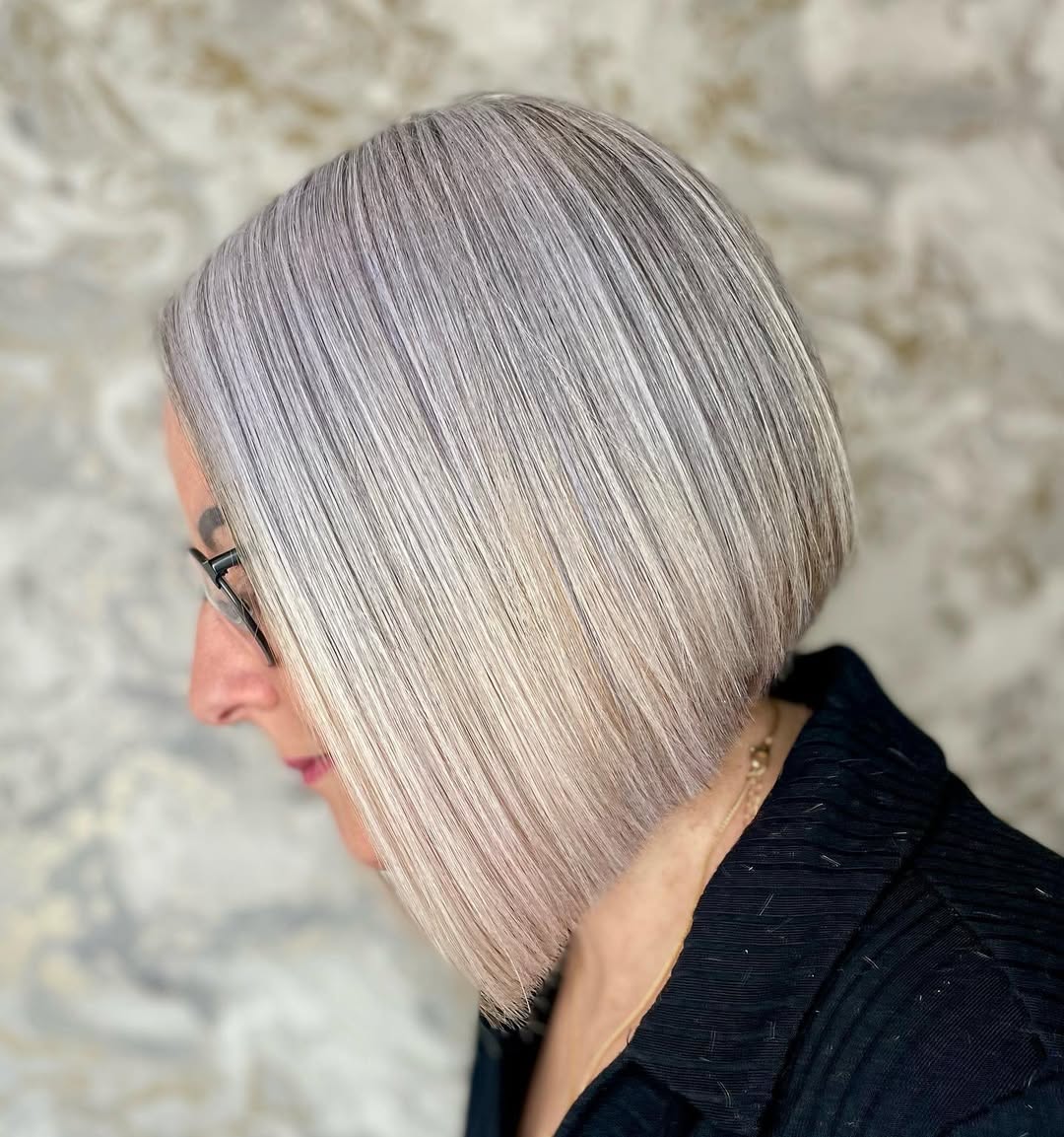 A shoulder-skimming crop with blunt ends and soft layering in upper stands gives your mane a thicker appearance and effectively hides a sagging jawline. Remember about occasional toning and deep conditioning to keep your grays bright and soft.