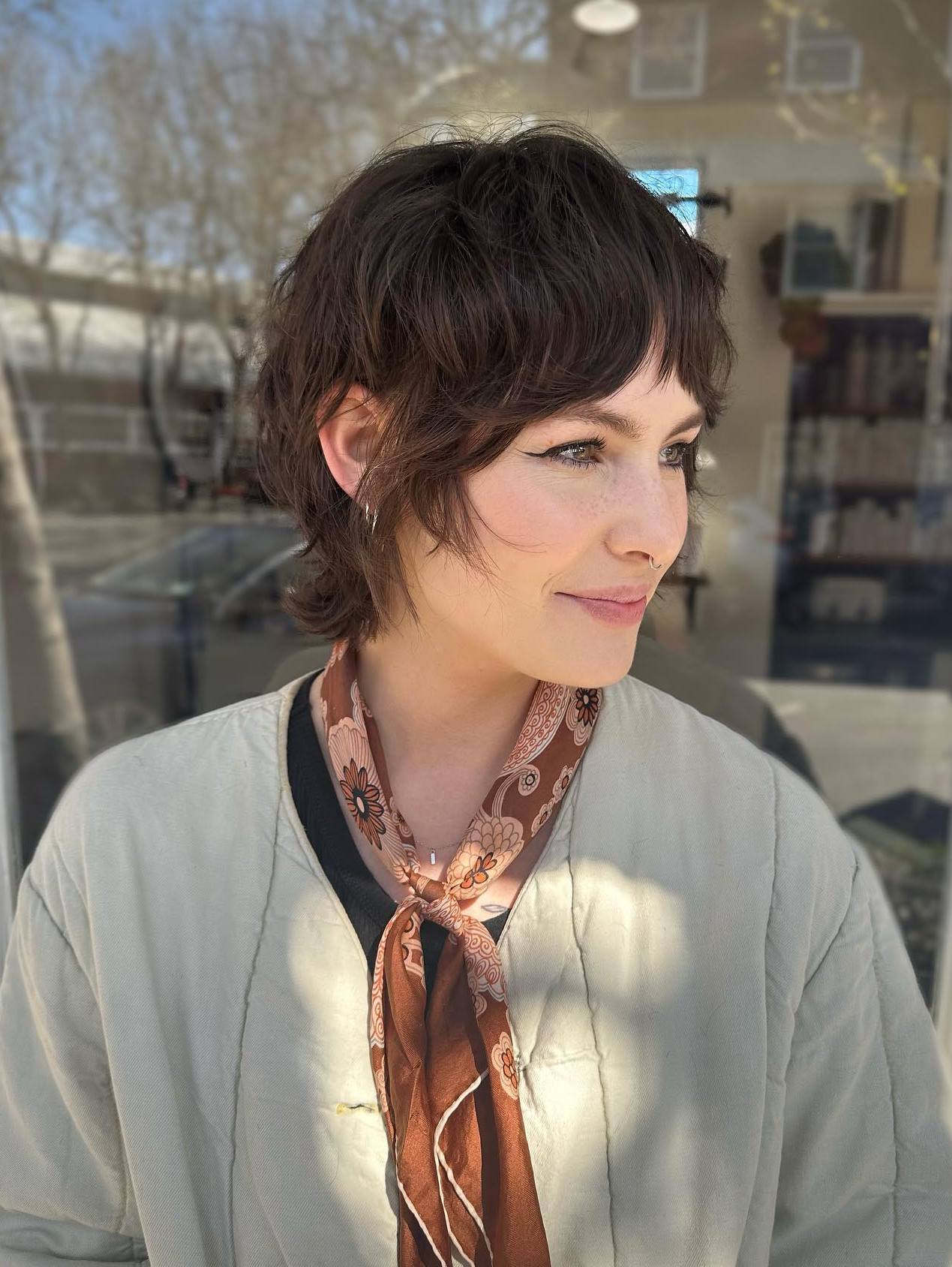 If you have a natural bend to your hair, a shag cut will enhance your texture beautifully. Brown hair with highlights is perfect for this style—the subtle brightness adds dimension and brings out the movement in the layers, creating a soft, effortless look.